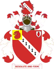 Gules a bend Ermine on a canton Or a lion's head erased of the first.