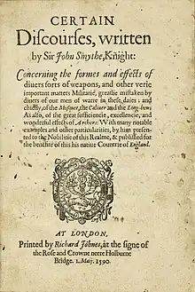 - ↑ Smythe's letter: Ellis, Henry, ed. (1843). "Sir John Smyth, imprisoned in the Tower, to Lord Burghley; owing the details of his recent offensive behavoir, and entreating pardon". Original letters of eminent literary men of the sixteenth, seventeenth, and eighteenth centuries. Camden Society. Vol. 23. pp. 88–97.