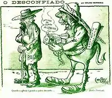 Caricature by Celso Herminio showing Robert Williams, a contract in his pocket, giving Portugal a railway line in Lobito.