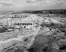 The Allies spotted the construction of the Siracourt bunker almost as soon as it began in September 1943, when two parallel trenches were dug and concreted to form the walls of the structure.[2] Heavy Allied bombing hindered construction but it continued until the end of June 1944, when the site was wrecked by Tallboy bombs dropped by the Royal Air Force. By this time about 90 per cent of the concrete had been completed, apart from the end sections, but the supposedly bomb-proof structure proved unable to withstand the six-ton Tallboy. One bomb fully penetrated the roof and exploded underneath, while another caused substantial damage when it exploded next to one of the walls. The ground around the site was churned up by over 5,000 tons of bombs.[1] By the time the site was abandoned in April 1944, the exterior had practically been completed but the excavation of the interior had only just begun.[2] Roland Hautefeuille estimated that Siracourt was the most heavily bombed military target in all of Europe with 5,070 tons of bombs directed at it.[5] These bombs considerably change the terrain around the site, destroying most of the village of Siracourt. After the war, the authorities quickly abandoned the idea of demolishing the bunker. Before the land was leveled, 80 German prisoners of war removed the launching ramp facing England and partially filled in the interior of the bunker.[6]