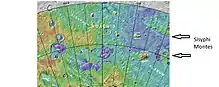 Sisyphi Montes is a mountain range within the Sisyphi Planum on the planet Mars. The mountain range various degrees of degradation.[1] It has a diameter of 200 kilometres (124 mi). The name Sisyphi Montes is a classical albedo name. This was approved by International Astronomical Union in 1985.[2][3] The classical name comes from the myth of Sisyphus, in Greek mythology. Sisyphus, the king of Corinth, was punished in Hades by having to roll a huge stone up a hill only to have it roll down again as soon as he had brought it to the top. He had to do this over and over again.[4] There are a number of mountains in this range, hence the plural form of Sisyphus is used for this group of mountains.[5]