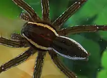 Around 10–14 days after mating occurs, female spiders produce egg sacs which they then transport within their mouths. Egg production can happen anytime between June and September and occasionally, but not often, in April.[4] Before hatching, the female builds a "nursery web" over vegetation and guards it.[15] The egg sac is placed among leaves to help keep it concealed. After the offspring have hatched, they sit under her protection in the web until they are ready to disperse into the outside world. The offspring leave the web about a week after they hatch.[7] Females exhibit intense defense of egg sacs, which are so strongly attached to the mouthparts that removing the egg sac from the mouthparts results in egg sac rupture. When boldness was measured as the time spent on the water's surface versus submerged (with more time on the surface seen as bolder), females were bolder during parental care and spent more time above water. This trend, while initially surprising, may reflect the energetic costs of staying underwater with an egg sac or developmental impediments when eggs stay underwater for extended periods of time.[16]