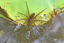 Prey detection is thought to arise through two different strategies - the use of tactile stimuli on the water surface and via eyesight. For the former strategy, the anterior two pairs of legs rest on the water surface and respond to the stimuli of ripples along the water surface. They are often seen with their legs sprawled out by the water while they are waiting for prey. They hunt by the water's surface in which they can walk on water and dive under up to 18 cm (7.1 in) to capture prey. Their good vision contributes to their success when diving to capture prey.[7] They capture underwater prey as well as prey that fall on the water's surface or travels on water, such as water striders. Visual stimuli, while used, are less important.[5]