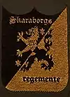The coat of the arms of the Skaraborg Regiment (P 4/Fo 35) 1977–1994, the Skaraborg Brigade (PB 9/MekB 9) 1994–2000 and Skaraborg Regiment (P 4) since 2000. Blazon: "The provincial badge of Västergötland, per bend sinister sable and or charged with a double-tailed lion rampant counterchanged, armed and langued gules between two estoiles argent in the first field. The shield surmounted two arms in fess, embowed and vambraced, the hands holding swords in saltire, or".[8] The coat of arms of the Skaraborg Regiment (P 4/Fo 35) 1994–2000 and the Skaraborg Group (Skaraborgsgruppen) since 2000. Blazon: "The provincial badge of Västergötland, per bend sinister sable and or charged with a double-tailed lion rampant counter-changed, armed and langued gules between two estoiles argent in the first field. The shield surmounted two swords in saltire, or".[8]