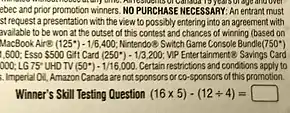 Example of a contest form with skill testing question on the bottom and free entry alternative listed in the fine print