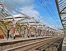 On 1 October 1888 platforms 5 and 6 were added to serve the Skipton to Ilkley Line, which opened that day. These platforms were at a slightly higher level on a rising gradient, as the new line ran southwest of the existing line and then crossed over it by bridge eastwards.[12][13][14][15] These platforms were also later used by the Yorkshire Dales Railway, a short branch to Grassington from 1902 to 1930.[16] Passenger services to Ilkley ceased on 22 March 1965,[17] after which platforms 5 and 6 were closed to passengers and their access subway was bricked off.[11] However, the line through platform 5 is still in use as a single-track freight line to Swinden Quarry via the former Yorkshire Dales line. The track through platform 6 has been lifted.[14] The 1847 station buildings survived intact (latterly used as offices) until 1967, when they were demolished. The site is now occupied by a supermarket.