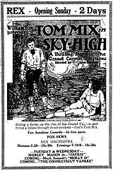 Principal photography for Sky High took place at the Fox Films studio in Los Angeles and on location at the Grand Canyon National Park, Arizona, Williams, Arizona, and the El Tovar Hotel, Grand Canyon National Park, Arizona.[2][3] While Tom Mix rarely used doubles, Bud Creeth was hired as a "stunt pilot", flying with Dick Grace to film the dangerous stunt of hanging from a rope over the Grand Canyon.[4][N 1]