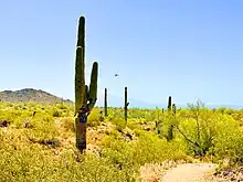 The landscape is desert and mountain. Desert mule deer, javelina, desert fox, raptors and Sonoran Desert tortoise are found in the park. Vegetation includes ironwood, palo verde and mesquite trees; many types of cacti are also found.[2]