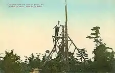 The first fire lookout structure built on the mountain was a wooden tower. The site was operational in 1912, at which time the site was deemed unsuitable for fire lookout operations and later officially closed in 1916. In 1934, a 35-foot-tall (11 m) steel tower was built on the mountain, but was never used for fire lookout purposes. The tower later deteriorated and was removed in 1968.[3]