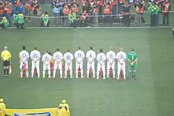 Slovakia participated in the FIFA World Cup for the first time as an independent nation after finishing in first in 2010 FIFA World Cup qualification – UEFA Group 3 ahead of Slovenia, Czech Republic, Northern Ireland and Poland. On 14 October 2009, they clinched qualification with a 1–0 away win against Poland.[7] On 24 June 2010, at the tournament proper, Slovakia finished second in the group stage after defeating reigning champions Italy in a game which ESPN dubbed "epic": the game saw three goals being scored after the 80th minute, two by Italy and one by Slovakia, as well as a disallowed goal by Italy flagged offside by "the tightest of decisions". The result led Slovakia to the knockout stage and eliminated Italy, who finished last in the group.[8] The result of this match meant that for the first time in World Cup history, both finalists from the previous tournament had been eliminated from the first round, champion Italy and runner-up France.[9][10]