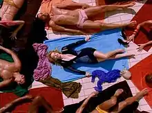 The accompanying music video for "Slow" was directed by Baillie Walsh and choreographed by Michael Rooney.[48] The video was shot in Barcelona, Spain,[49] and begins with a scene of a man diving into the Piscina Municipal de Montjuïc swimming pool[50] and coming out of its edge, where a number of very lightly beachwear-clad people are sunbathing. Minogue stands out in a series of different zoom central shots lying on a sky-blue towel wearing a dark blue bodyhugging Balenciaga dress.[47] The next scenes of the video capture her singing the song through different camera angles, particularly during the chorus when the camera angle shifts to a "bird's eye" view and show Minogue amid beach models performing synchronised choreography to the dance beats.[49] A reviewer from District MTV commented that the video showed that "synchronised sun bathing is more fun than it sounds".[49] Ben Taylor from Swide Magazine included the video in his list of Minogue's "Best Music Video Moments".[51] Used for promoting the song, the video premiered earlier than the song's release date, on 21 October 2003.[48] Minogue talked about the video, saying: