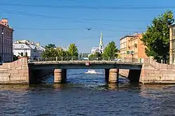 In 1800 – 1810, the drawbridge span structure was replaced by a wooden girder. In 1867, the span structure was overhauled. In 1888, the wooden spans were replaced with metal ones, and the supports were moved.[4] For this part, some of the Kryukov Canal water was pumped out and the work was carried out in a dry pit. During the repair of the bridge, a temporary bridge was built.[5] In 1940, the span structure of the bridge was reinforced by welding horizontal metal sheets to the upper and lower shelves of the I-beams of the girders. At the same time, the three-span system and the general appearance of the bridge was preserved.[4]