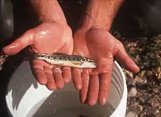 Steelhead trout (Oncorhynchus mykiss) are native to Smith Creek, although the construction of Calaveras Dam blocks in-migrating fish.[9] Both Smith Creek and Arroyo Hondo were recorded in 1905 by John Otterbein Snyder as holding anadromous Steelhead trout (Oncorhynchus mykiss) streams.[10][11]