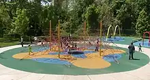 In July 2005, the Ann Newman Giant Wooden Slide was reopened,[6] and in August 2006 a new complex of swings called "Swing City" was opened.[7] By 2009, an area about three football fields in size had been redone, and the outside of the Playhouse preserved.[8] On July 31, 2019, a statue inspired by Ora Washington, titled "MVP", was added to the playground.[9] The Giant Slide is 40 feet (12 m) long, 12 feet (3.7 m) wide, 10 feet (3.0 m) high, and 12 children can use it at once.[3] The playground is for children 10 and under, accompanied by at least one adult 18 or older. There is a special play area for very young children.