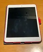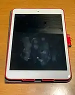 An iPad used by children with its touchscreen covered with fingerprint smudges