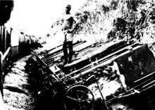 Derailment south of Ilebo, Zaire (note steep drop-off). Derailments were averaging 10 per month along the heavily traveled and badly worn portion of tracks between Tenke and Ilebo in 1983