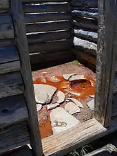 The ruins of the cabin are located directly over the gaseous spring and are thought to have functioned as a spring-house, rather than as a dwelling, preventing livestock from fouling the spring. The cabin measures 9 feet (2.7 m) by 11 feet (3.4 m). Its walls extend to about 7 feet (2.1 m). There is no roof. The cabin had no windows and one door in the north side. The logs are laid with V-notched joints.[2]