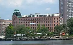 Hugo Sohmer, founder of Sohmer & Co., relocated his manufacturing premises from 149 East 14th Street in 1886 after building a new building on the Astoria coast of the East River. The company was moved to be closer to better shipping facilities and in order to be more accessible for the labor force in charge of operating the production.[4] He had founded the company few years earlier in 1872 together with his partner Joseph Kuder from Vienna, who was also a former Steinway and Sons employee. The new building of Sohmer & Co. was designed by Berger & Baylies architecture firm. Entering in piano building business in NY in the end of 19th century was not a hard thing to do as there were many skilled emigrants coming from Europe (mostly Germany) and the demand for the instrument was growing fast. The building was expanded by Baylies & Co. architecture firm in 1906–07. In 1925, the factory was an impressive 210,000 square feet piece of property and the company employed 275 people who were responsible for producing 2,500 pianos a year. The company was family owned and operated for much of its existence; the Sohmer family had nearly 70 years of combined experience in the piano business. Their products included a grand piano, uprights, and a player piano, but their uprights were specifically admired for having a more powerful sound than competing pianos on the market. Additionally, the Sohmer Grands came in four sizes: Concert, Parlor, Baby, and Cupid.[4] The factory was highly regarded because of its state of the art facilities and equipment.[5] In the time of the Great Depression parts of the building were leased out to other manufacturers. However, the company survived the Great Depression, but after the collapse of piano industry, Sohmer's production rates fell. By 1960, the factory had an assessed value of $255,000 and a heavily decreased labor force of 120 people. The factory maintained production in its Astoria factory until 1982 when the grand son of Hugo Sohmer sold the company to Pratt-Read company - producers of piano pieces and furniture.[6] The plant was then relocated to Ivoryton, Connecticut, and the building sold to Adirondack Chair Company. Between 2007 and 2013, the building was converted for residential use with new penthouse additions above the sixth floor.[7] Currently Sohmer pianos are produced in Korea. Several photographs of the factory have been made available online by the Queens Public Library, including a view from 1945 from across the East River.[8]