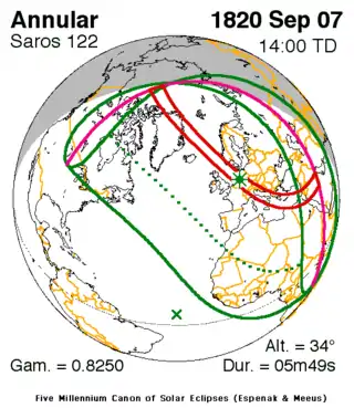 An annular solar eclipse occurred on September 7, 1820. A solar eclipse occurs when the Moon passes between Earth and the Sun, thereby totally or partly obscuring the image of the Sun for a viewer on Earth. An annular solar eclipse occurs when the Moon's apparent diameter is smaller than the Sun's, blocking most of the Sun's light and causing the Sun to look like an annulus (ring). An annular eclipse appears as a partial eclipse over a region of the Earth thousands of kilometres wide.