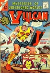 The Johnny Mann version of Son of Vulcan first appeared in the Charlton Comics series Mysteries of Unexplored Worlds #46 (May 1965), retitled Son of Vulcan with issue #49, and was created by writer Pat Masulli and artist Bill Fraccio.[1] Charlton staff writer Joe Gill would write most of his stories. Predating the Charlton "Action Heroes" line, Son of Vulcan is not properly part of that group. His final Charlton story, "The Second Trojan War" in Son of Vulcan #50 (Jan. 1966, the last issue, after which the title became Peter Cannon, Thunderbolt for another ten issues), was the first professional work of writer and future Marvel Comics editor-in-chief Roy Thomas, with the previous issue having seen the character being given a new and more ornate costume designed by a young, cover-credited Dave Cockrum. DC has made very little use of Son of Vulcan. He appeared briefly in DC Challenge #9 where he was introduced into the DC universe by the aforementioned Roy Thomas and returned to take a more pivotal part in the War of the Gods miniseries that followed the Crisis on Infinite Earths crossover only to be killed off in the last issue. In 2005, DC published a new Son of Vulcan miniseries whose title character and series premise was unrelated to the original.