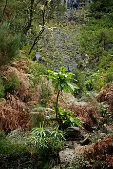 The giant sow thistle is found on the islands of Madeira.[10][1][3][12] Where it grows within the Northern laurisilva cloud forest habitat within Madeira,[6] at an elevation of 800-1200 meters. There have been reports of giant sow thistles on the island of Porto Santo, where it is rare.[2]