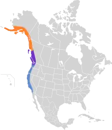 - Breeds on the mainland south from the Stikine River to northwestern Washington. Winter range from southwestern British Columbia south to coastal central California. (Weckstein et al. 2002)