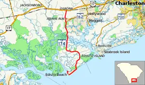 South Carolina Highway 174 (SC 174) is a 25.730-mile (41.408 km) state highway, connecting Edisto Beach with the western part of the Charleston area, in the southeastern part of the U.S. state of South Carolina. The highway was designated a South Carolina scenic byway in 1988. In 2009, the U.S. Department of Transportation declared that a 17-mile (27 km) stretch of SC 174 on Edisto Island would be designated as a National Scenic Byway.[3] According to the South Carolina Department of Transportation (SCDOT), the southern terminus is at the southern terminus of Yacht Club Road, where Palmetto Boulevard changes name to Dock Site Road. However, the signed southern terminus is at an intersection with Dock Site Road and the western terminus of Buoy Road, approximately 1,112 feet (339 m) to the northeast.