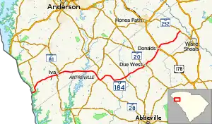 - ↑ Google (May 9, 2016). "Overview map of SC 184 (western terminus to Due West)" (Map). Google Maps. Google. Retrieved May 9, 2016.