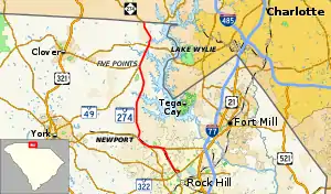 South Carolina Highway 274 (SC 274) is a 17.537-mile (28.223 km) primary state highway in the U.S. state of South Carolina. It connects the cities of Rock Hill and Gastonia, North Carolina. Though it travels generally in a north–south direction, it is signed west–east.