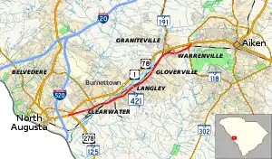 SC 421 begins where it splits off from US 1/US 78 (Jefferson Davis Highway) southwest of Clearwater; it immediately connects with US 278/SC 125 (Atomic Road). Heading northeast, it parallels US 1/US 78 to its south, going through the towns of Clearwater, Burnettown, Langley, Gloverville and Warrenville. Upon entering Aiken, it reconnects with US 1/US 78. A majority of the highway is four-lanes that travels a total of 10.4 miles (16.7 km).[2]
