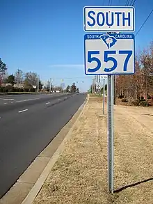 SC 557 is a two-lane rural highway that traverses 6.7 miles (10.8 km) from SC 55 near Clover to SC 49/SC 274 in Lake Wylie. The highway provides travelers a more direct route to and from Charlotte. Though it runs physically west-to-east, it is signed as a north-south highway with its western end as its southern terminus and vice versa.[2]
