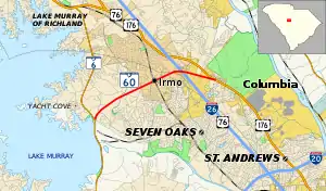 SC 60 is a mostly four-lane with median suburban highway that travels 5.16 miles (8.30 km) from SC 6 to U.S. Route 176 (US 176), with an interchange with Interstate 26 (I-26)/US 76.[3]