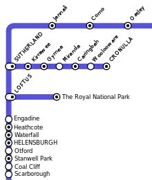 At Sutherland, three platforms are provided. The Cronulla line branches off in an eastwards direction south of the station. The former short branch line to Woronora Cemetery branched in a westerly direction at the south of the platforms. The line opened on 28 July 1900 and closed on 27 August 1944.[24] The line then continues south through Loftus, Engadine, and Heathcote. South of Loftus, the former Royal National Park line branched off, this has now been converted into a tram line connecting to the Sydney Tramway Museum, and connections to the mainline have been severed. The final station for the operation of suburban services is Waterfall station. At Waterfall, there is a train stabling yard and a train turnback (shunting road) south of the station. South of Waterfall is the site of the 2003 Waterfall train disaster.