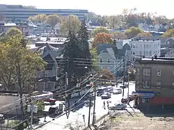 ![]() Atlantic Street in the South End with many elements of the neighborhood: empty lot, modest homes and businesses, Pitney Bowes modern office building and, in upper lefthand corner, the end of the defunct Yale & Towne factory building | |