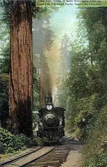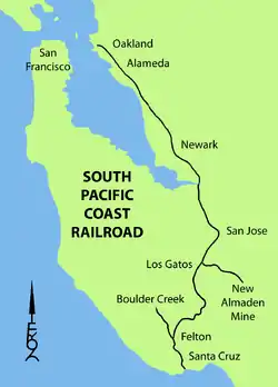 The South Pacific Coast Railroad (SPC) was a 3 ft (914 mm) narrow gauge steam railroad running between Santa Cruz, California and Alameda, with a ferry connection in Alameda to San Francisco. The railroad was created as the Santa Clara Valley Railroad, founded by local strawberry growers as a way to get their crops to market in San Francisco and provide an alternative to the Southern Pacific Railroad. In 1876, James Graham Fair, a Comstock Lode silver baron, bought the line and extended it into the Santa Cruz Mountains to capture the significant lumber traffic coming out of the redwood forests. The narrow-gauge line was originally laid with 52-pound-per-yard (26 kg/m) rail on 8-foot (2.44 m) redwood ties;[1] and was later acquired by the Southern Pacific and converted to 4 ft 8+1⁄2 in (1,435 mm) standard gauge.