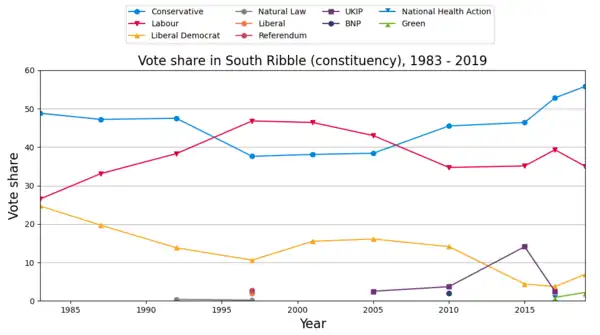 Former Preston North MP Robert Atkins won the South Ribble constituency in 1983 and fought the seat in every election up to the 1997 general election. At that time, in dramatic bellwether fashion, Labour's David Borrow gained the seat on a clear majority, with nearly 26,000 votes, 2,000 less than Robert Atkins' victory in 1983 which was the equally unusual landslide result. From the 1997 "landslide year" until 2010, David Borrow's vote total and majority consistently shrunk with a swing back to the Conservatives at every election. In terms of the other parties, Liberal Democrats have not thus far achieved better than third and 2005 saw UKIP nominating a candidate for the first time, and taking just over 1,200 votes. Borrow finally lost South Ribble in 2010 on a large two-party swing to Conservative Lorraine Fullbrook.