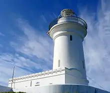 The tower is 40 feet (12 m) from the ground to the lantern, made of mass concrete. Its external plan is round, a unique feature as the later two lighthouses of the same series, at Smoky Cape and Green Cape, used an octagonal profile. The internal well is 40 feet (12 m) in diameter. The walls taper from 4 feet 6 inches (1.37 m) at the base to 2 feet 3 inches (0.69 m) at the top. The tower is topped by a concrete oversailing cornice which is capped by the gallery itself, made of sixteen basalt blocks, each weighing 30 long hundredweight (3,400 lb; 1,500 kg), which were shipped from Melbourne. The gallery is surrounded by a gunmetal handrail.[2] Three levels of cast-iron stairs lead to the lantern room on top of the tower.[4] Attached to the tower is a stores annexe.[2]