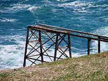 Also at the premises are the remains of a 13 metres (43 ft) above sea level jetty, the third to be constructed.[4] The first jetty was constructed in 1878 during the construction of the lighthouse, and was only 5 metres (16 ft) high. It was destroyed in 1904 and a larger jetty was built. This second jetty was repaired and reconstructed multiple times, in 1913–1915 and 1932.[5] Finally, the third jetty was built in 1959.[11] The shore end of the jetty was demolished in 1986.[2] As of 2008 the jetty still stands, though most of it has rusted and fallen into the sea. A small storehouse in poor shape stands next to the jetty.[4] The storehouse is the oldest building on the island, being constructed in 1879–1880.[5]