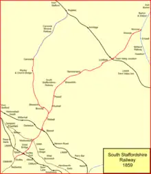 The South Staffordshire Railway (SSR) was authorised in 1847 to build a line from Dudley in the West Midlands of England through Walsall and Lichfield to a junction with the Midland Railway on the way to Burton upon Trent, with authorised share capital of £945,000. It was supported by the newly-formed London and North Western Railway (LNWR) and the Midland Railway, giving each company access to important areas. It completed its main line in 1849. As collieries in the Cannock region rose in importance, it built a second main line from Walsall to Rugeley, as well as numerous short spurs and connections to lines it intersected. Colliery working in the Cannock area expanded enormously, and mineral traffic carryings increased in step.