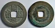In the year Qiande 2 (961) Li Yu ascended the throne,[7] and the resources of the country being exhausted, his minister Han Xizai obtained permission to cast coins. These were Kaiyuan Tongbao (Chinese: 開元通寶; pinyin: kāiyuán tōng bǎo) cash coins and are written in both clerical (or li) and seal script and date from 961. These distinguished from Tang dynasty period Kaiyuan Tongbao cash coins by the broader rims, and the characters being in less deep relief. The seal script writing was devised by the scholar Xu Xuan.[2] This coin was slightly larger than the old Kaiyuan Tongbao cash coins, and had broader rims, and was found convenient by both the government and the people. As they were massively produced these Kaiyuan Tongbao cash coins still exist in large quantities today.[3] As the Tangguo Tongbao cash coins also exist in very large quantities today it's suspected that they continued to be manufactured during the first two years of the reign of Li Yu.[4]
