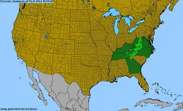This species is found in the Southern and Central Appalachians at high elevations, often at prominences within the landscape (especially at the southern end of their range).[3] They are state listed in Georgia (S1), Kentucky (S1), North Carolina (S4), Virginia (S4), and West Virginia (S4).[5]