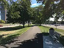 Integral to the City Centre is its connected pedestrian- and bicycle-friendly shared-use path, which spans 7.75 miles. The four-season path highlights public art, historical landmarks, bike-share stations, decorative birdhouses and nature. In 2019 and 2020, the areas along northbound and southbound Northwestern Highway service drive underwent construction to expand the shared-use path and on-street bicycle lanes.[44]