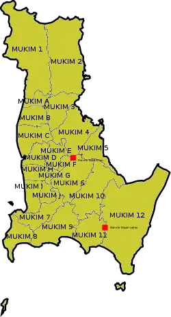The South-West District comprises 16.8% of Penang's total land mass.[7] It is further divided into 22 mukims.[1]