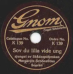 Label for a 1925 Swedish recording of Sov du lilla vide ung, sung by Margareta Schönström. "Gnom" was a German-produced record label designed to play on toy gramophones for children; the platters were only 15 cm in diameter (i.e., smaller than a 45-rpm gramophone record.[10]