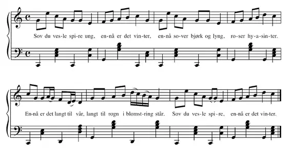 • In 1900 the Danish-Swedish composer Preben Nodermann (18671930) published a melody (with minor modifications of Topelius's text) titled Solskenets visa ("Sunshine's song") in Sex visor för barn ("Six songs for children").[7] Danish and Norwegian versions of the song, entitled Solskinnsvise, have become well known and have been published in Norway both as sheet music and as recordings.[8]