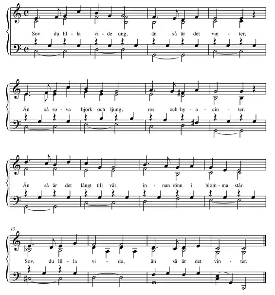 • Alice Tegnér's musical setting for the song was published in 1895 in the third booklet of the Sjung med oss, Mamma! ("Sing with us, Mama!") series, under the title Videvisan ("Willow song")[4] Tegnér adjusted the text slightly to fit her melody and modernized the spelling.[5] Tegnér's songs were reprinted in 1943 in the Nu ska vi sjunga ("Now we shall sing") anthology under the title Visor om djur och blommor ("Songs about animals and flowers").[6]