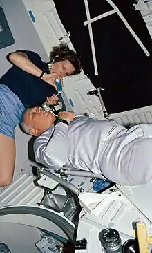 - 1 2 Wotring, Virginia E. (July 17, 2015). "Medication use by U.S. crewmembers on the International Space Station". The FASEB Journal. 29 (11): 4417–4423. doi:10.1096/fj.14-264838. hdl:2060/20140017010. PMID 26187345. S2CID 205373370.