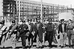 There was no clear leader in the PCE Madrid executive; some point to Vicente Pertegás as the man who effectively took command of Communist actions in the days to come.[31] Two senior local party men Arturo Jiménez and head of the military section Domingo Girón departed to El Pardo at north-western outskirts of Madrid, home to general staff of the II. Corps and the nearest one of all corps HQ sites; their intention was to convince colonel Bueno to form a force which would enter Madrid and crush the rebels. However, Bueno vacillated; Jiménez and Girón returned to Villa Eloisa. Girón was then asked to contact Barceló; however, on his way he was detained by rebel troops and incarcerated.[32] Another attempt was directed at Guillermo Ascanio Moreno, a zealous Communist and commander of the 8. Division, subordinate of Bueno.