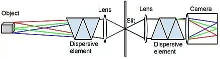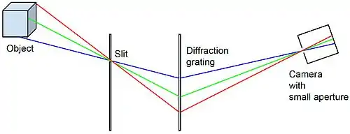 A prototypical spatio-spectral scanning system, introduced in June 2014, consists of a basic slit spectroscope (slit + dispersive element) at some suitable, non-zero distance before a camera. (If the effective camera distance is zero, the system is applicable to spatial scanning). The imaging process is based on spectrally-decoded camera obscura projections: A series of projections from a continuous array of pinholes (= the slit) is projected onto the dispersive element, each projection contributing a rainbow-colored strip to the recorded two-dimensional image. The field of view in the wavelength-coded spatial dimension asymptotically approaches the dispersion angle of the dispersive element as the camera distance from the dispersive element approaches infinity.[1] Scanning is achieved by moving the camera transverse to the slit (stationary platform), or by moving the entire system transverse to the slit (mobile platform).