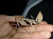 Brown sub-adult female Sphodromantis sp. "Blue Flash" on a hand. These mantids are often green.